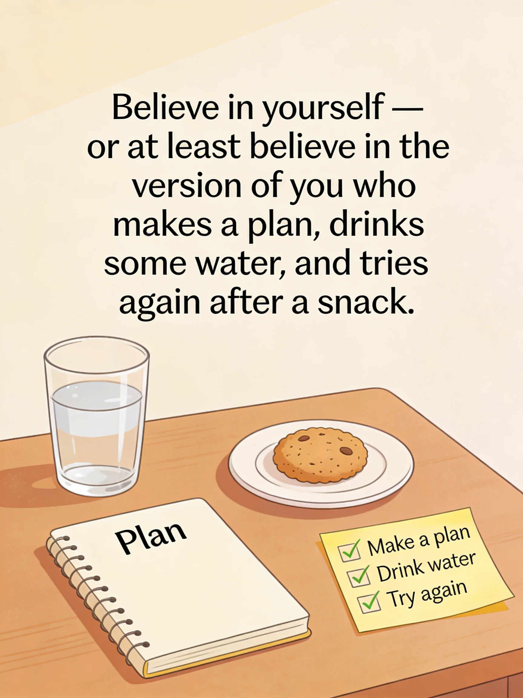 Believe in yourself — or at least believe in the version of you who makes a plan, drinks some water, and tries again after a snack.